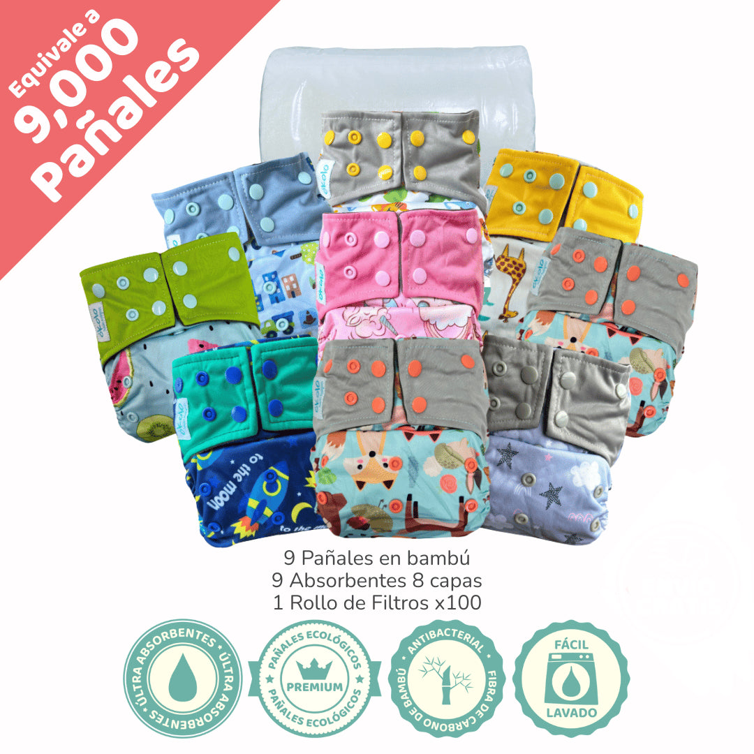 Combo básico x9 Pañales Ecológicos en bambú + Filtros x100