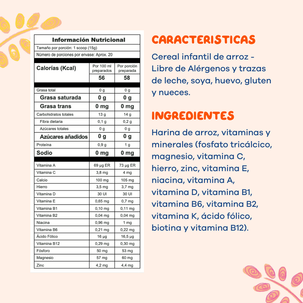 El Cereal Infantil de Arroz FIIDO® está formulado por nutricionistas para ofrecer una alimentación complementaria segura, suave y 100% libre de alérgenos, ideal para bebés de 6 a 24 meses. Perfecto para familias que buscan un alimento sin azúcar, sin lácteos y sin trazas, que apoye el crecimiento saludable del bebé.