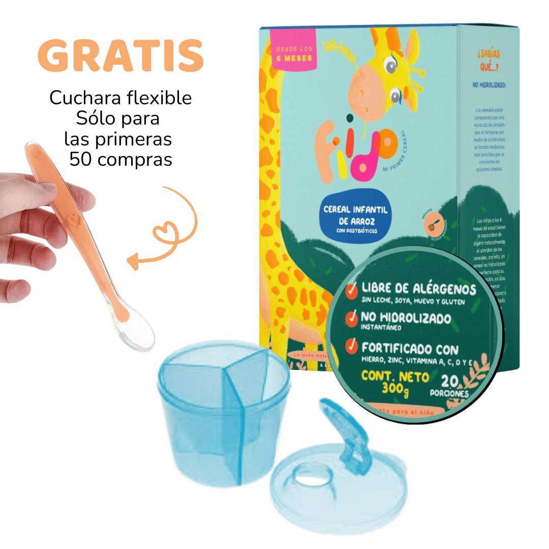 El Kit Cereal Infantil FIIDO es la opción ideal para iniciar la alimentación complementaria del bebé desde los 6 meses, de forma segura, práctica y nutritiva. Incluye cereal infantil de arroz FIIDO, dosificador de cereal y cuchara flexible GRATIS (promo limitada).